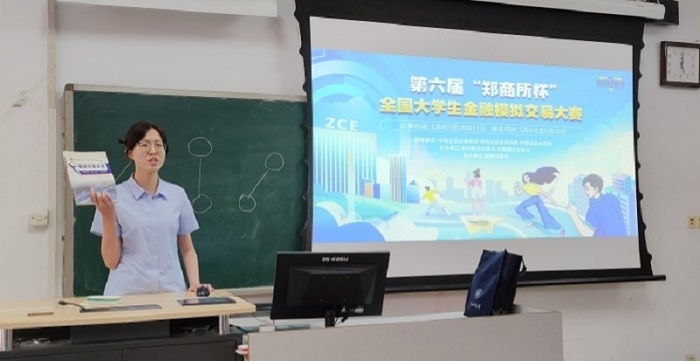 隨后,投資咨詢部分析師王大元為學生介紹了第六屆鄭商所杯模擬交易大賽,講解了期貨交易過程中出現(xiàn)的“加倉”“鎖倉”等概念,并對如何使用交易軟件進行了重點解讀,引導同學們在官網(wǎng)學習專區(qū)進行學習,鼓勵同學們踴躍參賽,爭創(chuàng)佳績。