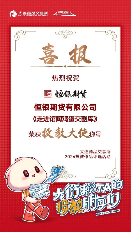 近日,由大連商品交易所舉辦的“大衍和TA的投教朋友們”——2024年大商所投教作品評選活動圓滿落幕。經(jīng)過激烈的角逐和嚴格的評審,國富公司所屬恒銀期貨有限公司(以下簡稱恒銀期貨)憑借《走進館陶雞蛋交割庫》的投教視頻作品,成功榮獲“投教大使”稱號。